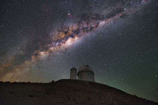 The telescope visible in this image is the ESO 3.6-metre telescope at La Silla. It is mounted with the High Accuracy Radial velocity Planet Searcher (HARPS) which is dedicated to the discovery of exoplanets. In the smaller dome to its left is the Coudé Auxiliary Telescope, which was decommissioned in 1998. Above the telescope the Milky Way and its galactic bulge can be seen.